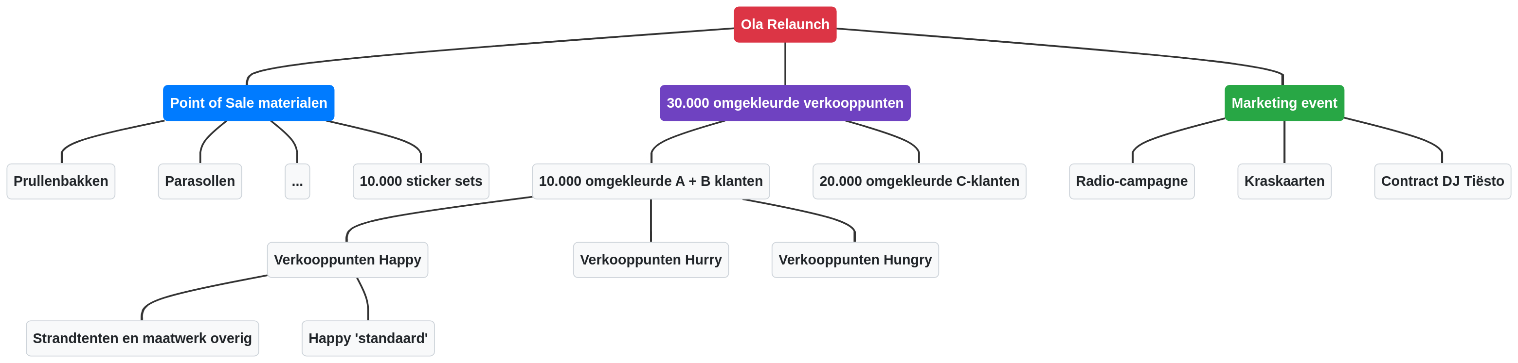 Global Project Performance mocht de projectmanager leveren om de OLA Relaunch in Nederland verder te leiden. De nieuwe PRINCE2-projectmanager ontwikkelde direct een volledige PBS. Deze omvatte: